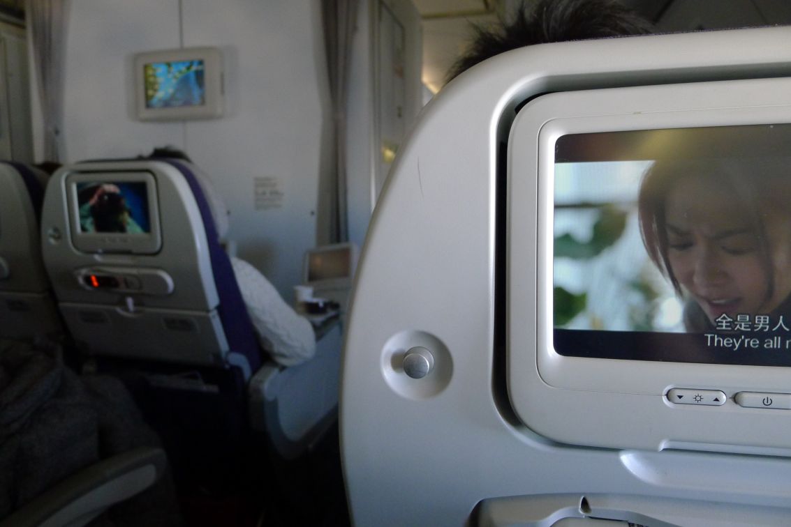 機内。モニターに映っているのは「閨密」という映画。面白いです。