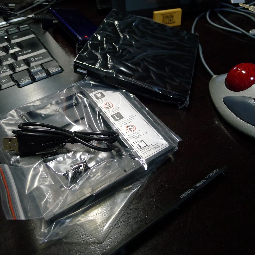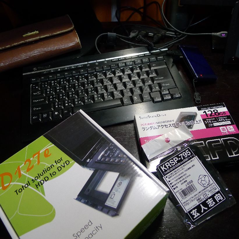 同梱されているのは取り外したドライブを外付けにできるケース。その横”玄人志向”は7mmを9.5mmにするスペーサー。その上がCFDの128G SSD。(TOSHIBA製SSD採用 2.5inch 内蔵型 SATA6Gbps 128GB CSSD-S6T128NHG6Q)