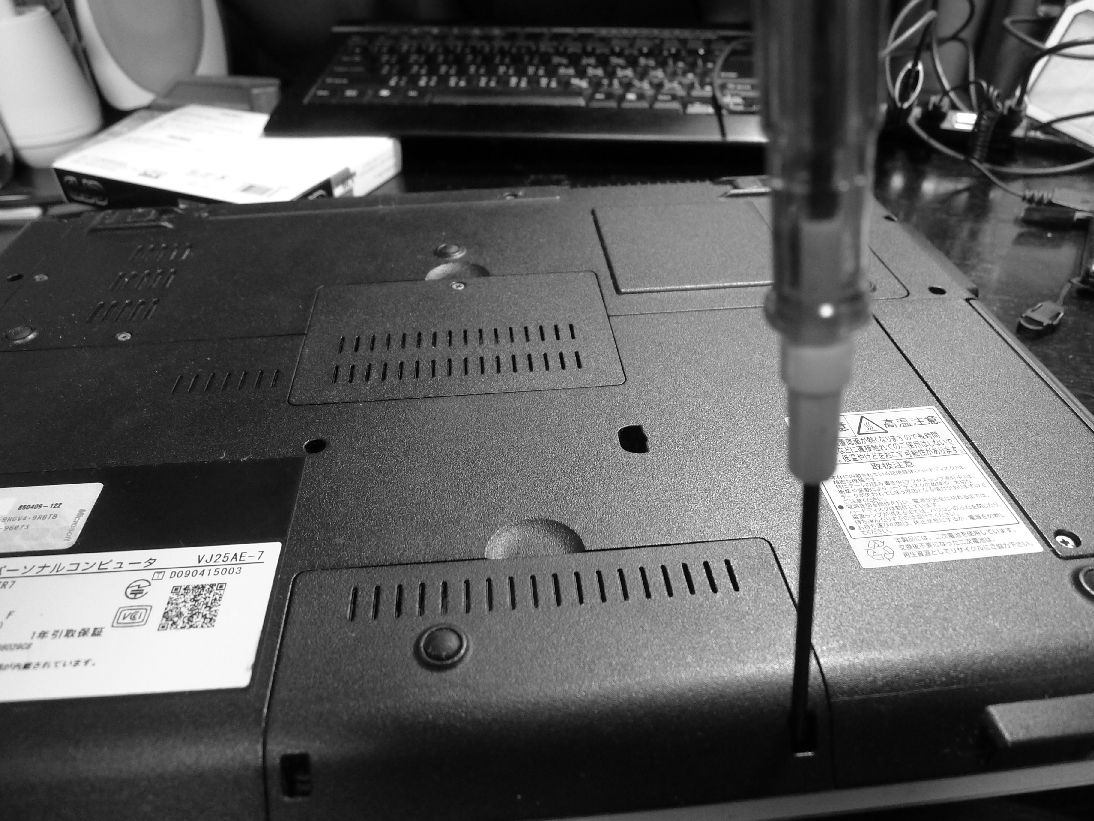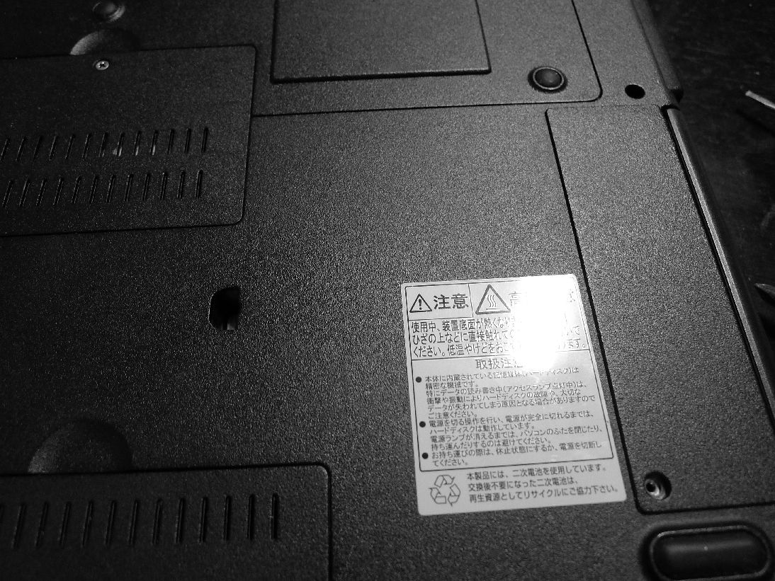 右下に見えるネジと左側やや中央にあるネジを外す。BTOが効くノートは基本的にばらすのが簡単。