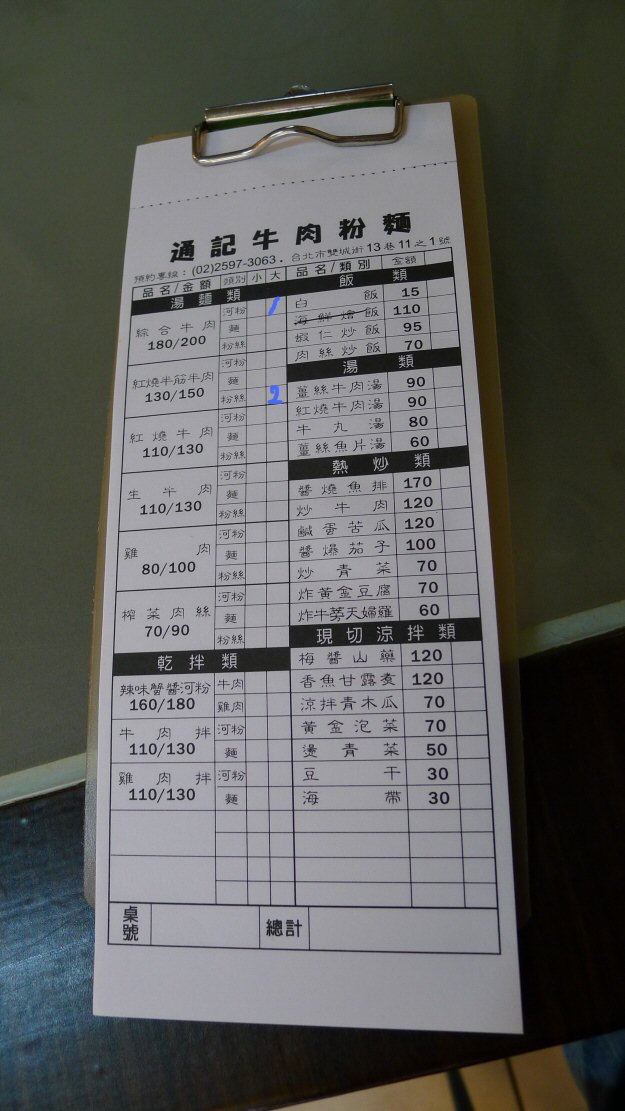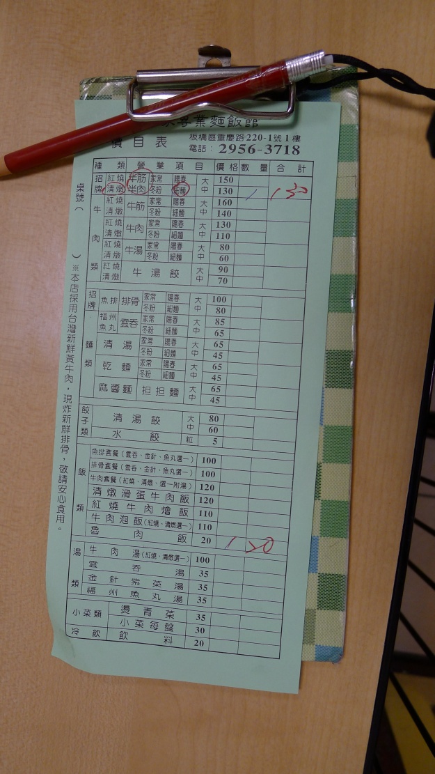 ”綜合牛肉 180/200” とあります。これは小と大の価格です。そして、その右横に 河粉 麵 粉絲 とあります。これは麺の種類です。そしてその右横が数字を記入する欄です。