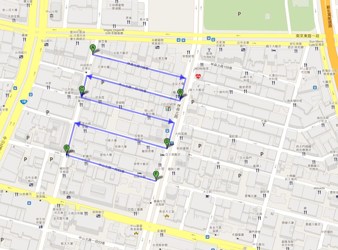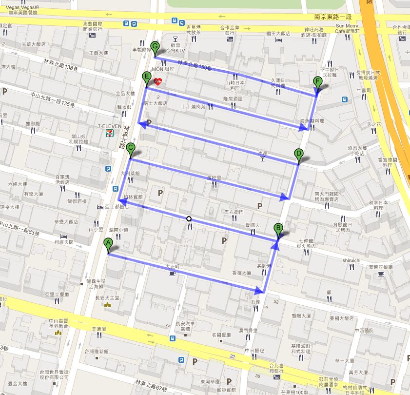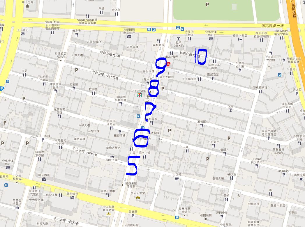 今回は林森北路東側、南より五条通りから七条通りまでを紹介。