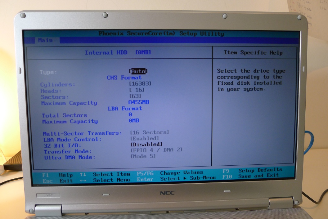 C+A+Dで再起動し、BIOSを覗くと、一応HDDは認識している。