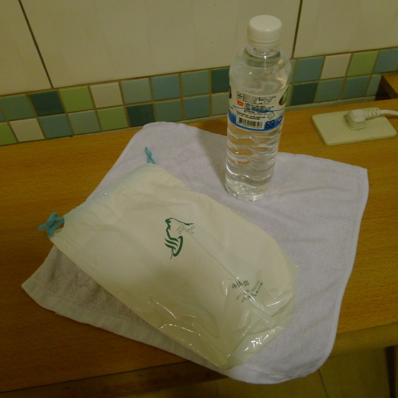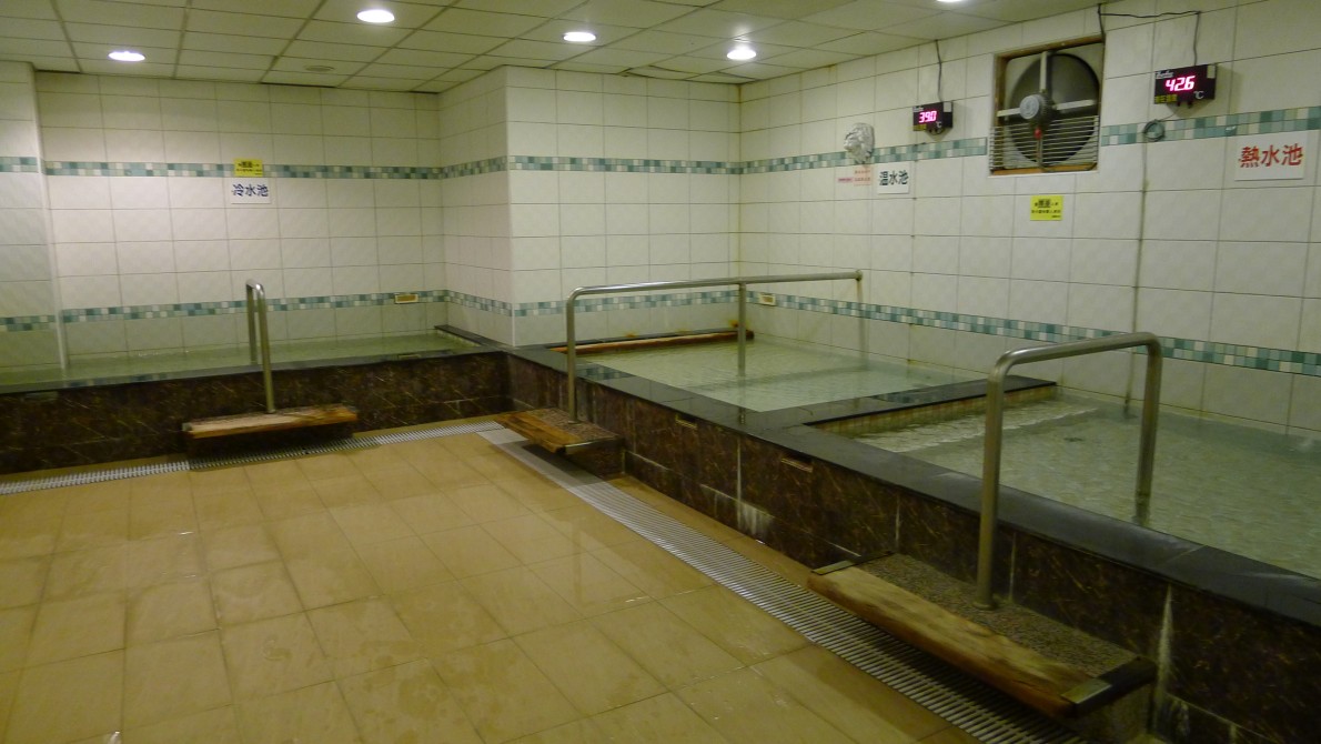 泡湯二四〇元。ペットボトルの水一本とちいさなタオルが一枚渡される。タオルは持ち帰っていいとのこと。受付の小姐に五〇〇元札を渡したのだが、釣りを六〇元しかよこさない。
