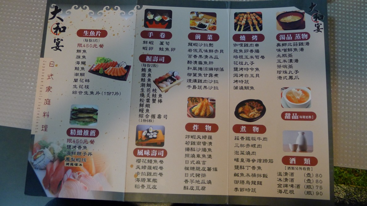 かなりぐるぐると走り廻った。時間は既に午後八時半。そろそろ何か食べなくては。気が進まなかったのだが新生路と博愛路の交差点にある『大和宴』という日本料理の店に入ってしまった。実は私、自分では魚もさばくし、刺身も作る。ふぐもおろせる(一応免許をもっている)のだが、刺身があまり好きではない。