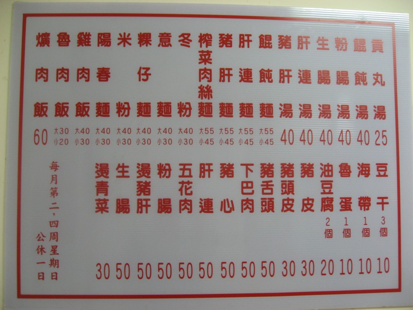意を決して、注文したのはいつもの陽春麵三十五元と魯肉飯二十五元。我ながら進歩が無い。客は個性だらけの者ばかりだったが、店員は意外に良さそうな人だった。味もなかなか。客がいると言うことはそれなりに理由がある。